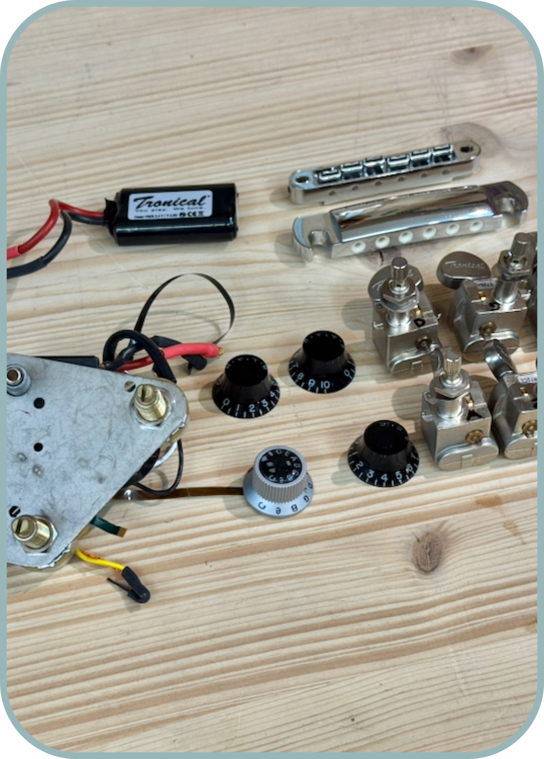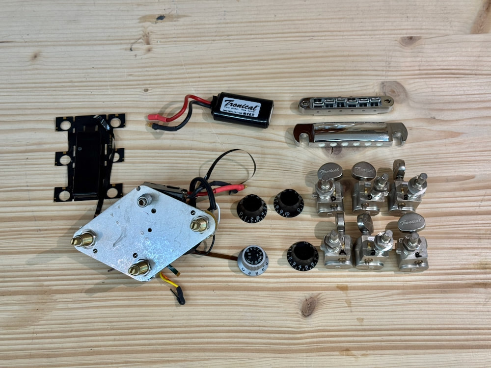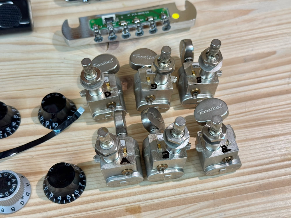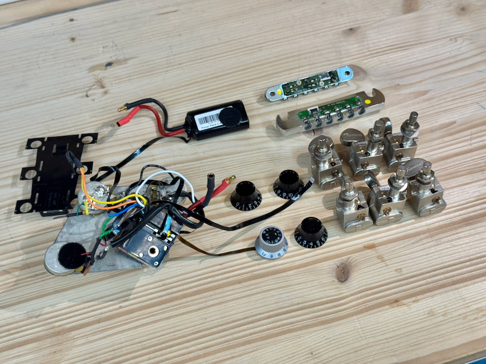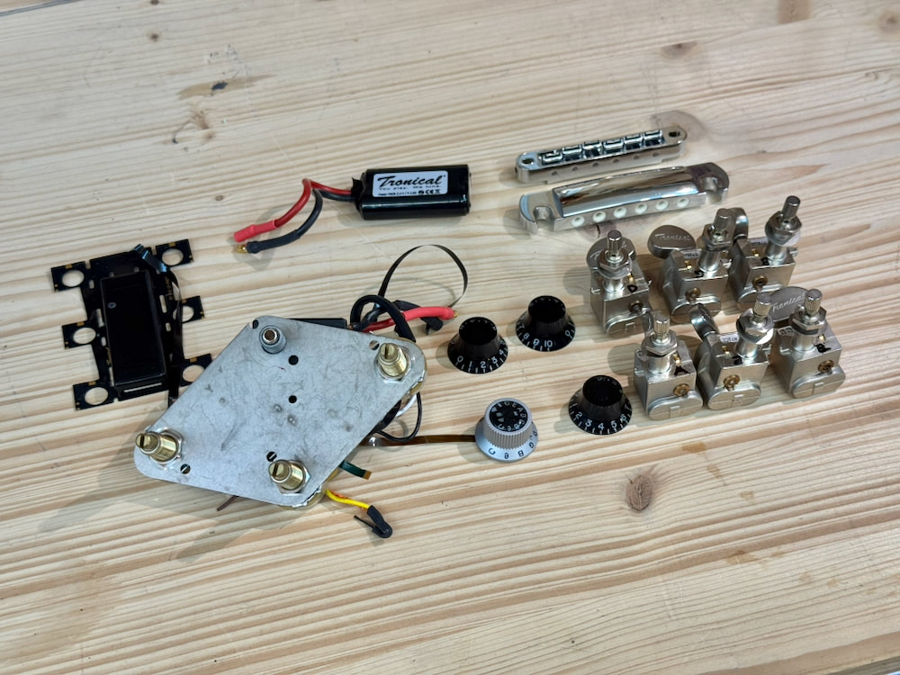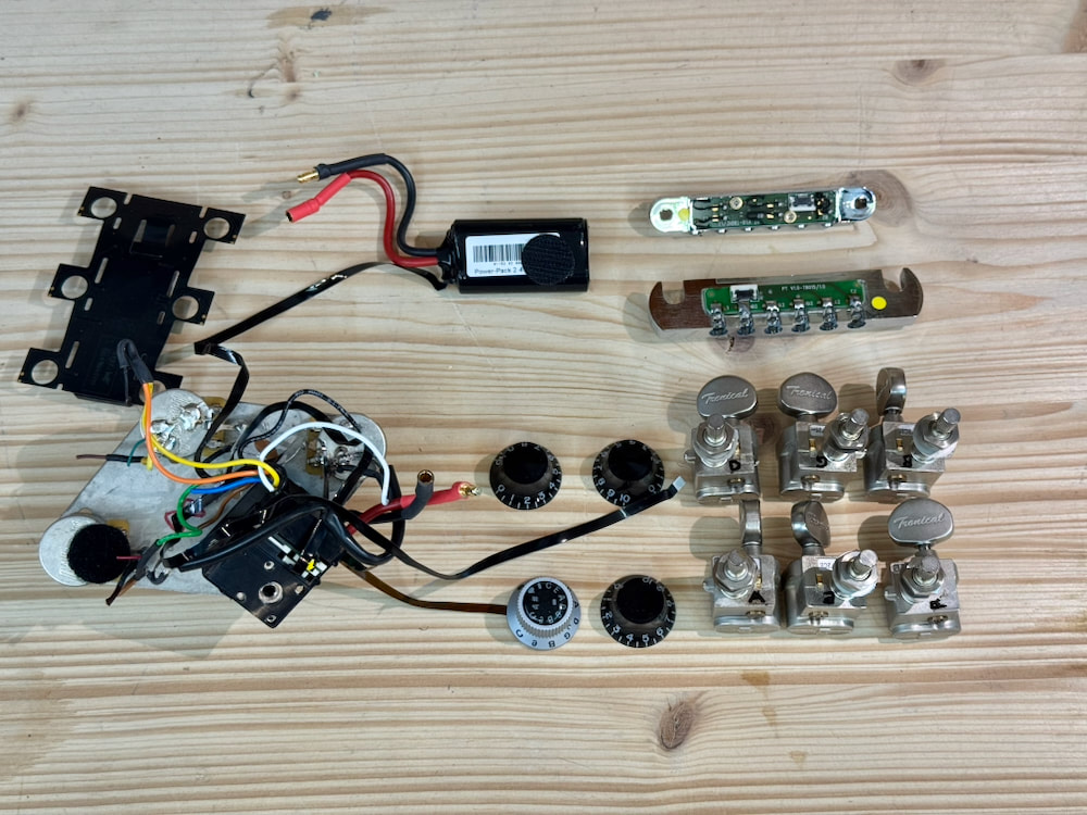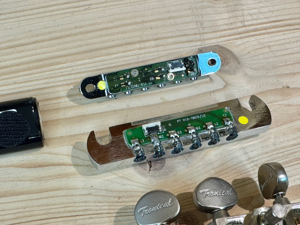 Powerhead Tuners, Tune-o-Matic Brücke / bridge mit individuellen Piezo-Sätteln, Stoptail mit aller Elektronik, Master Control Knob (MCK) und Platine für die Kopfplatte und Akku.